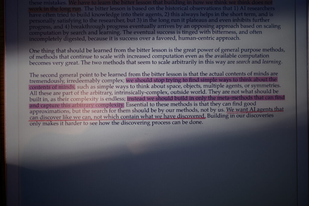 Richard 在文章结尾说: “We want AI agents that can discover like we can, not which contain what we have discovered.” 在我看来,这句话也可以说:“我们应该努力去成为能够自己发现知识的人,而非只做别人结论的复读机。” 而他在博客文章中提及的“meta-methods”也像极了我们在哲学话题中时常会探讨的metaphysics。正如这些meta-methods非灌输而是通过学习庞大训练数据逐渐浮现的一样,我们对生活的理解也应该更多来自于对生活的体验。尤其重要的是,所谓体验不仅仅是尝鲜和猎奇,更是从日复一日的平淡重复中体味出滋味。